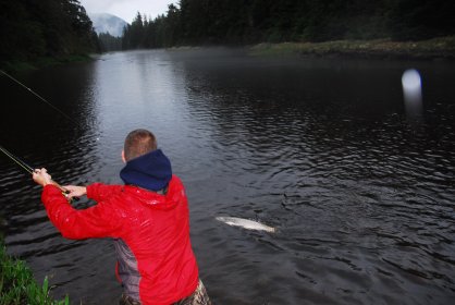 One day, when the sun shone bright and the rivers dropped into shape, and with our determination reining supreme, we loaded the boat and headed south down Wrangell Narrows, directing the bow beyond floating kelp heads, toward unsuspecting seagulls, around deadheads and rocks exposed by low tide. We wanted to catch the largest steelhead around and we aimed for a medium-sized stream known to produce fish ranging between six and 15 pounds.