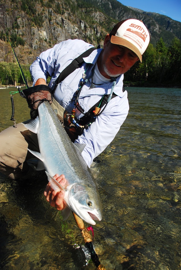Two hours later, after a brief orientation and a short downstream run in a skiff, I’m swinging Wombat, a fly that George Cook gave me, through a run called upper tidewater. So I’ve been fishing the Dean for all of 15 or 20 minutes and the line comes tight. In an instant, a fish is charging downstream like it just robbed a convenience store and has its Air Jordan’s in high -gear. My guide, Pauly, says, enjoy it. But I can’t enjoy it because I have, what, a hundred yards of backing peeled from the reel and the fish seems bent on a return the Dean River Channel. It finally holds, then works back upstream and soon I’m holding the chromiest eight-pounder I’ve ever seen. A little while later it’s a 17-inch sea-run cutthroat, followed by a six pound hen. A little while later I’ve tied into something substantial and when I get it to the beach it’s a 14-pounder. Say, an hour later, just as I’m at the tailout of the run and thinking, this is over, my line comes tight again. This time I’m thinking I’ve got a king because the fish is fighting slightly more disciplined than the others. But, alas, another steelhead, a sweet, bright specimen that Pauley calls 16-pounds. Let me tell you, I’m a lucky dude.