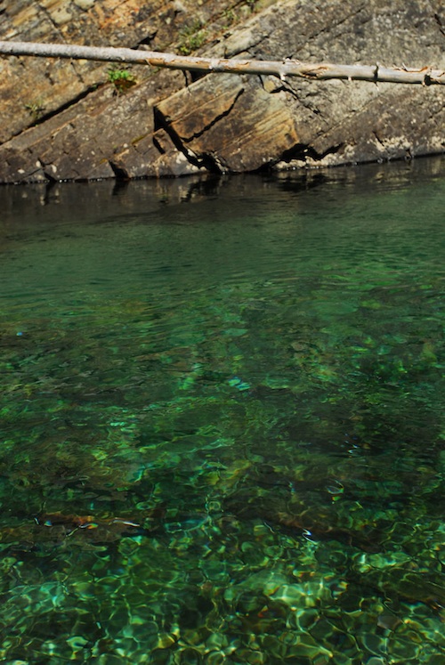 As a tributary flows into the main stem of the river, cold water enters the relatively warm river. These differences in temperature ranged from 2 to 14 degrees Fahrenheit. You can feel it, and sometimes see it. So can the fish. Temperatures in the Salmon increased as we moved downstream. In some locations most of the available main river habitat was too warm for native trout species. The fish were packed into the limited cold water areas where tributaries flowed into the river. Once the cold water plume mixed with the warmer main stem, fish were no longer observed.