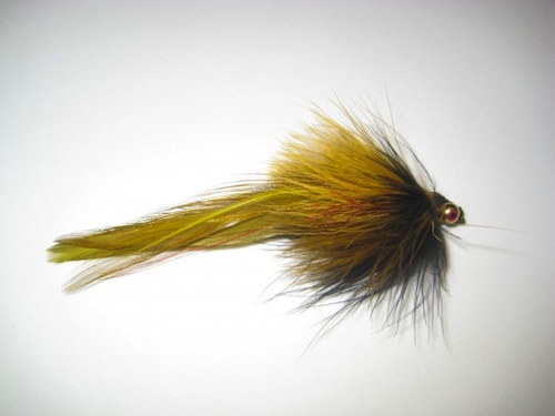 Head: 6 marabou feathers (2 yellow, 2 olive, 2 black)