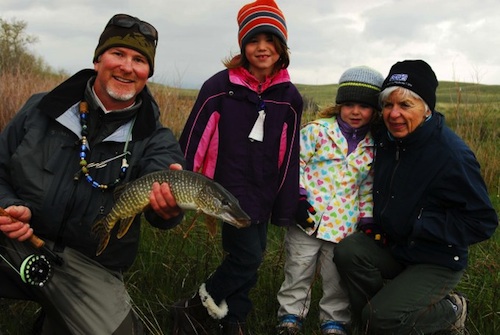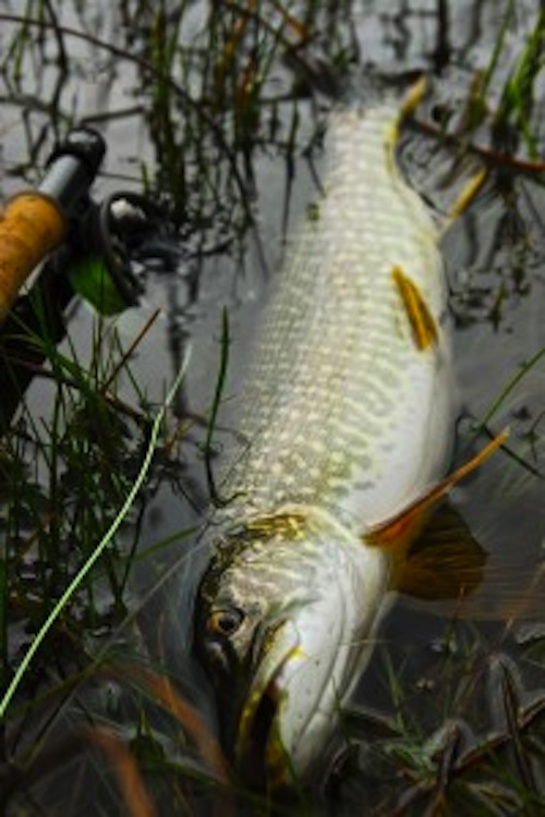 Pishkin Reservoir to fish for, get this, northern pike. I have about two hours of experience with pike under my belt and Byron hasn’t caught anything closer to a pike than an eastern pickerel. But we geared up and I set out in a boat and within a half-hour or so something slammed my yellow segmented streamer and thrashed on the surface. A few minutes later I had a pretty nice northern sliding onto the bank with the girls and the Vadsets checking it out. An hour later I had another one on.