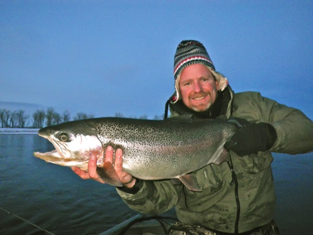 Of the dedicated trout heads I know, Galloup is as successful as any and he shared this recent picture of a hog rainbow, taken on the Missouri River, somewhere, Galloup says, bewteen Craig, Montana and the Dakotas. For you stats guys, that ‘bow measures 32 inches long and has a girth of 23 inches. Galloup took it on a black Sex Dungeon. Want to buy that fly? Click here.