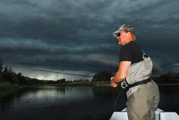 Kelly Galloup hoisting a monster Missouri River rainbow on a balmy day. Skinny jeans dudes need not apply.