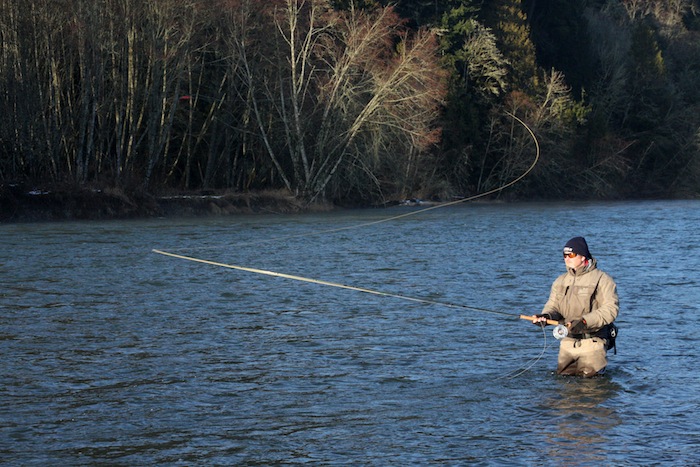 There’s good reason for the Skagit spey system’s appeal to me and others: spey rods cast farther with less effort than single-hand fly rods; they mend line efficiently, which allows anglers to really control the speed and depth at which a fly drifts; and, most important, they allow anglers to cast long, heavy, shooting heads and weighted flies with ease. That’s particularly advantageous on big, brawling coastal rivers that often flood and are guarded by forests that reach over the water. On such streams, anglers need a quick casting stroke so their backcasts don’t get caught in the brush and limbs behind them, and they need to efficiently cast those shooting heads and bright, heavily weighted flies into turbulent and oft-times murky water. Trying to do so with a single-hand rod, a light sink-tip line, and a bead-head nymph is like packing your Daisy to Africa for cape buffalo, expecting to take one of those brutes down with a shot to the iris. Can you say gored in the hip?