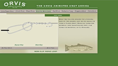 I’ve been thinking about a steelhead trip sometime in the near future, maybe even this weekend. And since I plan on swinging up fish, I’ll be tying on Pick Yer Pockets and Intruders. When swinging those big flies I like to use a non-slip mono loop knot, but the problem is this: I’m only fishing steelhead once or twice a year now and the rest of the time I’m tying on trout flies with an improved clinch knot. So, by the time I’m ready for steelhead I have to get a refresher on my non-slip knots. An easy way to do just that is to visit the Orvis Web site where they have an animated knot series that makes things pretty easy to learn. Want to tie the nail knot, the surgeon’s, the blood, or the clinch, among others? Hit the site and check it out. This is a great tool for beginners and an excellent refresher for anyone who’s headed out on the water. Here’s the link: