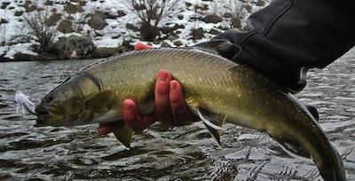 Now, I’ve fished the South Fork a lot, but that was mostly in the 1990s and early 2000s. At that time the rainbow population was excellent, but there were very few bull trout around. In fact, in all the times I fished the South Fork, and mind you a lot of those days were spent dredging with egg-sucking leeches for those oversized ‘bows, I only caught a single bull trout. That’s why I was surprised when, in January, during our conversation, Coe said he was catching lots of bull trout in the South Fork below Anderson Ranch. And then he sent pictures the other day, showing a bull trout that he caught.