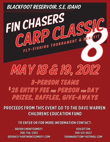 Fin Chasers Carp Classic 8 (“CARP ATE”) tournament will be held May 18 & 19, 2012 at Blackfoot Reservoir, South East Idaho. Anglers consisting of 3-person teams are competing for prizes in the Team Total-Weight division and daily men’s, women’s and kids biggest fish divisions. A mandatory rules meeting will be held at 8:00 AM, Friday the 18th at Pebble Beach Camp Site. Tournament starts each day with a shot-gun start at 9:00 AM and ends at 5:00 PM at same location for weigh in. Don’t have enough to make up a 3-person team? NO WORRIES! 2-person teams are welcome as well or if you are a single we will pair you up with a team.