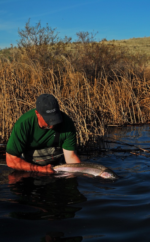 So, let’s cut to the chase. On Saturday I hooked 21 rainbows and landed 16 of them, with these appealing measurements—two 23-inch fish; two 25-inch fish; a 26-inch fish; and a 28-inch fish. I lost the biggest fish I hooked, a mega-beast I figured to go 29 or 30-inches and weigh 10 pounds or more.