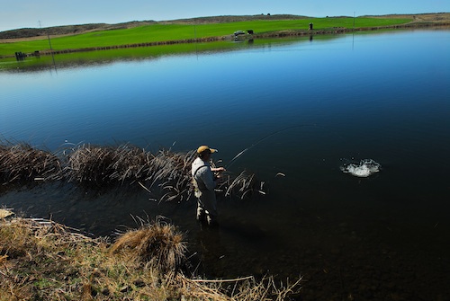 Spent most of my time wandering the banks with George Cook, who hosted me on those lakes at Back to the Wall Ranch outside Coulee City, formerly know as Issac Ranch. For big rainbows, that are especially hot during spring, you can’t beat this place. We blind casted leeches and chironomids some of the time, but also sight-fished to some cruisers that made our jaws drop, fish that we didn’t end up hooking. We broke for an awesome lunch of fine wines and hard salami, Cougar Gold cheese, roasted peppers and onions. By the end of the second day we hand’t made it back to Land of The Lost, which leaves much reason to return again next year, same dates.