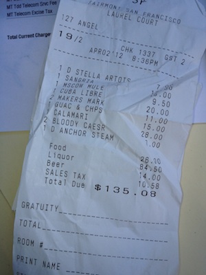 The thing is, this is a tab for two, and my pal that night is set up for a trip to the Gaspe Peninsula with me in less than a month. Having a few drinks, however, in San Fran is a little different from having a few drinks when you are on one of the most important and fortunate angling trips of your life. I’m sure we’ll be feeling fine in the evenings, especially if we can land a few Atlantic salmon (hell, one would be fine with me), but I also imagine we’ll keep it in check and take advantage of our wonderful opportunity. Countdown has officially began. Thought all of you would get a laugh at this one and maybe even recall some great nights in your life when the food to beer/liquor percentage was similar to this. Make sure to find the name of our server on the receipt. Ironic, isn’t it?