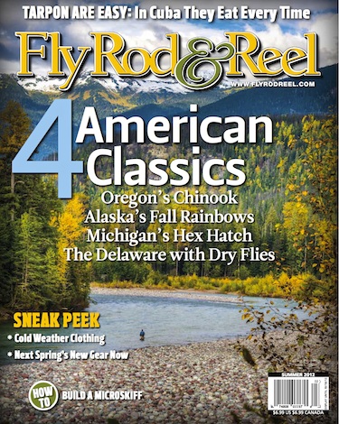 Giving all of you a sneak peek at Fly Rod & Reel’s fall cover. The magazine should be off the press and hitting newsstands any day. It’s a solid issue so make sure you check it out. You’ll find a fun article on the Delaware River and the “ghosts” of Lordville. You’ll get a really, really accurate portrayal of a fishing trip to Cuba. You’ll get to read the Robert Traver Writing Award winner, which is a piece on Michigan’s Hex hatch and night fishing. You can read a piece on how to build a killer microskiff. And you can learn how to tie some deadly patterns on jig hooks. And there’s Gierach on Oregon Chinook salmon. There’s also a Troy Letherman classic on his interest in fishing fall rainbows in western Alaska. Again, I think you’ll like this one so be sure to check it out.