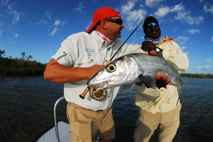 Armando Pagliari and David Tate hoisting a great bone from Abaco Island, Bahamas. More to show after today as we’re targeting some big fish. Based out of Abaco Lodge.