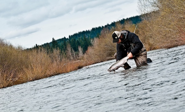 After the take that steelhead cartwheeled right next to the bank, almost beaching itself. Then it slid into deeper water and worked hard against the line and the bend of the rod. A few minutes later Hickman tailed an eight-pound hatchery hen for me, a bright fish in near perfect condition. We took that fish and I marked my license, thereby giving the river’s wild fish a better chance to find prime spawning turf. Tonight or tomorrow I’ll be grilling a side of that steelhead, sharing it with my daughters, recalling a great day on the Clackamas River with a great guide.