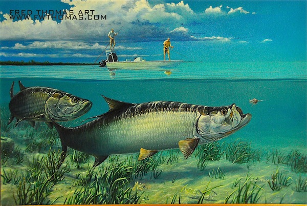 Many of you know that my father, Fred Thomas, is one of the country’s best wildlife artists and I thought I would share his work with you from time to time. Fred is willing to offer a discount to AT readers on specific Artist Proof prints. This week, with an eye toward tarpon season being here, he’s offering this beautiful print, titled Silver Mine, at a discount price of $60 + shipping, which is $25 off the standard $85 price.