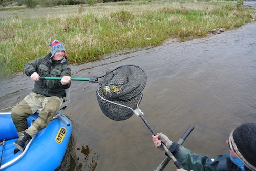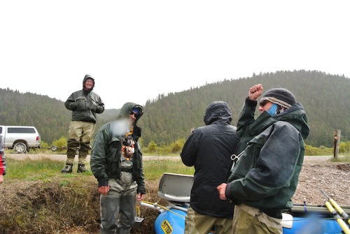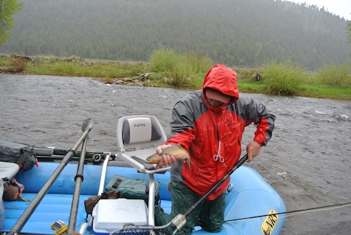 Still, rain or shine, my motto is FISH! So that’s what we did on Sunday. We packed up a crew of dudes and two rafts and headed to Rock Creek to float and fish the high roily stuff for browns and cutthroats. The weather people said it would be in the 70s that day, but I think I remember seeing the truck’s outdoor thermometer reading 42 degrees. And then the rain started and it didn’t stop all day, meaning we slogged through it for at least 8 hours. It was a good test of gear, that’s for sure with everyone reporting some level of saturation. Me, I got a little rain down my back, but only because I was delayed in putting a hood over my cap.