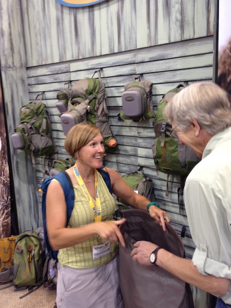 Backbone Media’s Kara Armano showing the new fishond gear to Fly Rod & Reel’s gear guru, Ted Leeson.