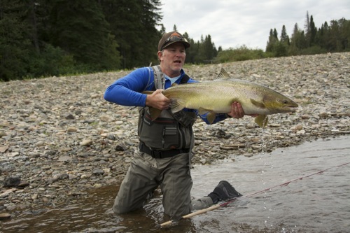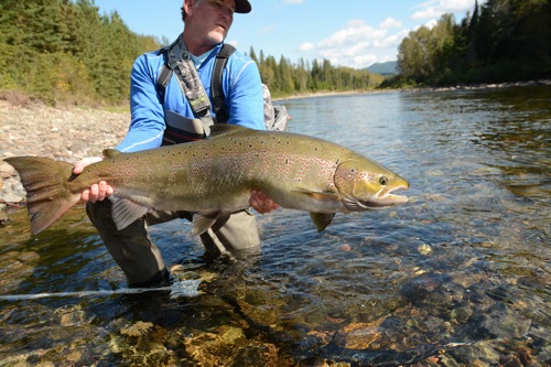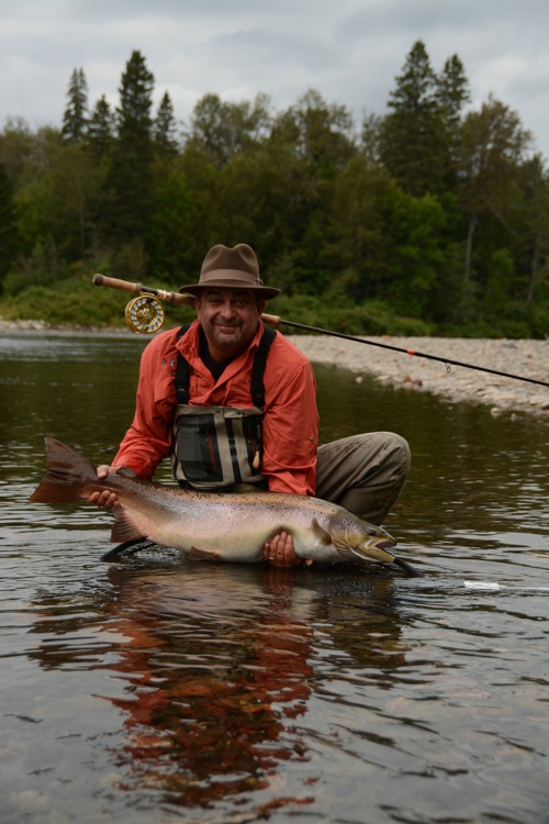 Pretty amazing to walk into some of these runs to see dark shapes scattered across the bottom, sometimes five or six side-by-side. In some cases there a hundred or more fish in each run and if you’ve fished steelhead in the Northwest, this would be the dream situation. But we’re fishing Atlantic salmon. I can’t say it’s easy, but if you can see fish you’re going to find out a way to catch them and that’s what we did again today. Lots of different flies. Different angles and presentations. And finally some takes. Beautiful river, great friends, and some incredible early fall weather. More details later. Enjoy the pics.