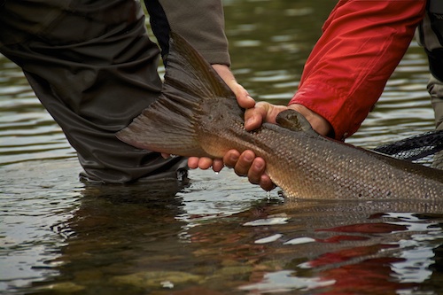 Gear: Got to take some sweet new gear to the Gaspe and I worked it hard during my six days on the water hucking-big. Here’s a rundown. SIMMS’ Vapor Boot—The guides were drooling over these. Lightweight, just as comfortable as hiking boots, sticky rubber bottom with screw-in studs, sturdy enough to provide the support my ankles need. Check em out Here. SIMMS Slick Jacket—Impervious to the rain that hammered down on us at times while fishing the Gaspe Peninsula. This jacket has a nice soft on the face, but sturdy collar, a great hood that cinches down and allows you to look around without blocking your vision, and pockets that can be opened so that you can reach inside the jacket and tuck your hands into your waders if needed. Can you say winter steelhead and saving those hands from pure misery? SIMMS G4 Pro Stockingfoot Waders—Super solid waders. Can’t go wrong. Banged around in these like crazy. Clamored over the rocks. Hiked through the forests. No worries here. These things are comfortable, super-durable and will keep you dry. Redington Dually Spey Rod—Just another super-sweet and affordable rod from Redington. I put the RIO SwitchChucker shooting head on this 7130 Dually and it threw really well with some larger flies and some T-8 tips. Also ran the RIO 480-grain Scandi line on this and that was a perfect match. Using that setup I was able to throw small wets on a dry line and I was able to put on a light sink tip and larger flies to get down. This was the setup I used when I wanted a nice delicate presentation. Sure, Redington supports Tonic and it’s in my favor to say nice things, but I have to say for (get this) $249 this rod gets you into the spey game super cheap and it’s not a rod you have to hide when the big boys show up. You can huck with this. You would be doing yourself a disservice if you didn’t pick one of these up and huck. SAGE Method Spey Rod—Ok, so you want the killer finish and fancy rod tube and the modern technology. And you want to huck super-big. Can’t go wrong here brothers. I fished the 7126 and there were times when I had to throw well over 100 feet of line, tip and leader to reach some pockets on the far side of the Grand that held fish. To complicate matters, I had to wade to my armpits and then huck. We even joked about the common directive I’d get from the guides, first thing in the morning. “Wade as deep as you can, Greg, and then throw that thing as far as you can.” That was worth some good laughs. The Method, which replaces Sages TCX line, did it for me. About the TCX rods; the TCX Deathstar was my favorite spey rod prior to getting the Method. It was the rod I fished. But this Method is “hway” better and I don’t see going back to the Deathstar. In fact, I was laughing at times because the Method was so much fun to throw. And this: typically, when I throw spey for salmon or steelhead it takes me a day or two to get into it and start throwing well. But I picked this rod up and immediately felt comfortable with it. Didn’t have to force things. Just took it slow and let the rod do the work. My suggestion? Try out one of these rods. I matched the 7126 with RIO’s 525-grain Skagit Max shooting head. Pretty amazing. Orvis Guide Slingpack—Was not a fan of slingpacks a while back. Teased my friends about their “purses.” But, as mentioned, I had to do some serious deep wading on the Grand and even when up to my armpits I could cinch the Slingpack tight and keep it high on my back, which kept it out of the water. This one was big enough to carry four fly boxes and all my tippet, plus a flask (Crown Royal, by the way) and a small camera.