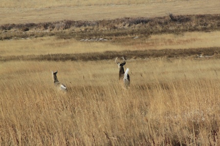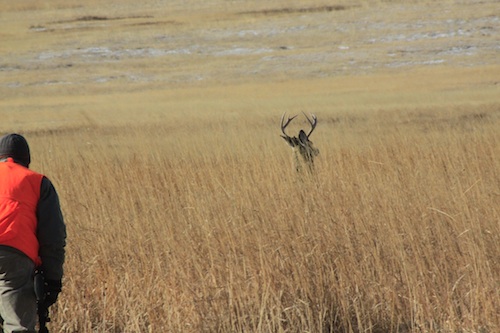 I thought all of you might enjoy this sequence that my dad, Fred Thomas, shot. I’d spotted this buck in the tall grass and decided to get a closer look at it. I didn’t expect this buck to grow larger during the stalk, but I had to take a look. I was hunting in Montana and the wind was howling about 40 miles an hour. It was five degrees outside. The deer, in general, did not want to move and they couldn’t hear me sneaking on them. I remember this as a pretty cool experience—I got within about 10 yards of this buck and a doe and was hoping a bigger buck was hiding in the grass, but no such luck. They fired out of there like rockets. Next year. Always next year. Enjoy.