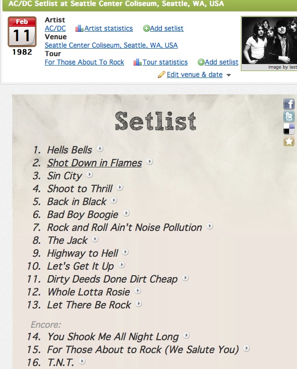 If this doesn’t date me nothing will. This is a set list from a concert I went to, my first, in Seattle, way back in the day. I would say this was one of the best, if not the best, shows I have ever seen. I think my sister and I were the only two sober people in the Coliseum. Who else was there? Were you? If so, what was your greatest memory from that night? Which of these songs is your favorite? Why? AC/DC heads (you know who you are) let’s hear what you have to say. Is this your top band to listen to while cruising to the fishing grounds? Come on Deeter, I know you’re out there. Also, in general, what were your greatest memories from the Coliseum? Sonics? Other concerts?