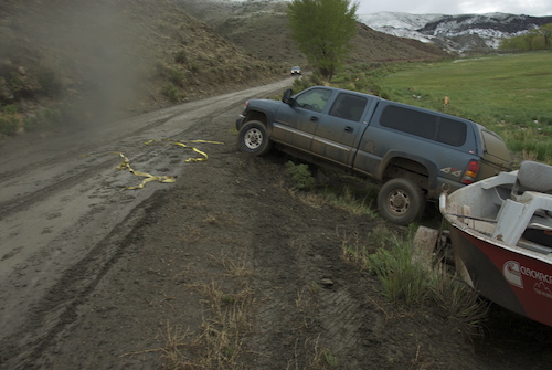 But I’d never left the road. Until one May day (ironic play on words) when I pulled out of Notch Bottom access on Montana’s lower Big Hole River and started along the infamous Burma Road. It rained and snowed all day and the road was absolute gumbo, although I didn’t really realize that until a particularly slippery turn, located about a mile from the access. That’s when I started around the corner and my tires abandoned purpose. And why wouldn’t they? First, they are low on tread and, second, a 300-pound driftboat and trailer was assisting that slide, spinning the back end of the truck toward an irrigation ditch. I remember thinking, So this is the time that I really go over a bank. And then, I’m sure glad I’m wearing a seatbelt and the doors are locked because, boy, this truck and the boat are rolling.