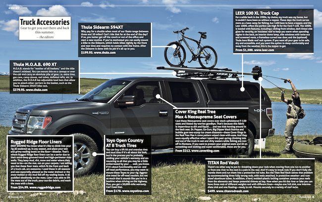 I penned this piece for Fly Rod & Reel back in the summer after putting this gear to a solid test. I’ve had it for six more months now and still feel that this account is very accurate. I am especially proud of the Thule M.O.A.B. 690 XT. That thing saves me when the back of the truck is loaded up. The Sidearm is a bit difficult, I have to admit, but only because my truck is high and when you mount that onto of the M.O.A.B, and then put a mountain bike on top, you need a fire ladder to reach it and you have to look out for low flying aircraft. Don’t even think about a car wash or parking garage. The Titan Rod Vault is a godsend when traveling from one hole to the next, or stopping in for a brew after fishing—your rods are safe when locked up in the Titan. The Leer canopy is total money—solid fit, looks great, keeps everything dry, including me and the girls when we sleep under it. After using the Rugged Ridge floor liners for, what, almost a year now, I don’t know how any flyfisher could go without these. The water from our wading boots, and the snowmelt from our boots and shoes during winter just pools right up in these. Perfect for taking care of your rig. The Toyo Open Country AT II tires now have an interesting story behind them—I drove 2,990 miles with them in September, to reach the pike and lake trout fishing grounds, and the moose hunting grounds, in northern Manitoba. This was a massive drive over some treacherous roads and through some major construction zones filled with jagged edges, massive potholes and major frost heaves. On the return trip I was way overloaded with a full moose and all my gear in the back of the truck. I hit some potholes that made me think the tires would pop, but they didn’t and they are still turning true on the F-150. Finally, the CoverKing seat covers are awesome. Completely comfortable, easy to clean. With two little girls riding in the back seat all the time, munching away on whatever they choose, those CoverKings have saved my interior. Here are more descriptions of the product.