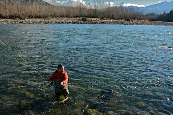 I wasn’t really thinking about that on Monday, however. I was more interested in getting a fly on the water with a chance to hook a beast. I’ve fished the Skagit and Sauk over the years and I’ve won a few battles and lost more. Having not thrown for steel since January ’14, this felt completely refreshing. It didn’t hurt that Monday morning turned out to be one of the prettiest I’ve ever enjoyed in western Washington, with blue skies in abundance, a fresh coat of snow on the Cascades, and the temperature holding steady in the high twenties. There were five of us, including Dave McCoy, who owns Emerald Water Anglers in West Seattle.