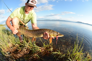 A solid pike on Wellesley Lake. When fishing from Kluane Lodge you’ll catch dozens of pike a day, many on surface poppers.