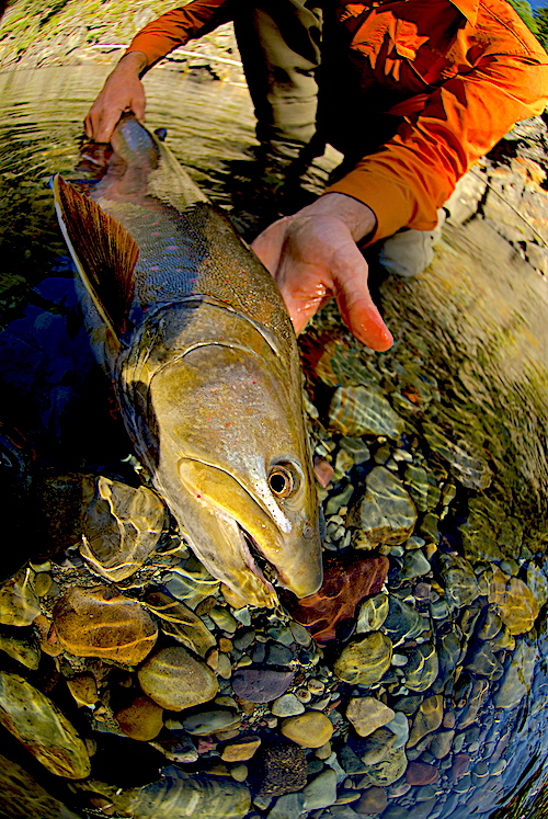 accounted for the most 20-plus inch browns and rainbows over the years, but my unofficial guess is that the Bitch Creek Nymph holds that spot. But don’t get the idea that this fly is only productive during the early summer salmon fly hatch. I’ve cut the white rubber legs off this pattern and deep drifted it during later summer, in crystal clear water, for picky British Columbia bull trout that ranged to 14 pounds. And I’ve sight-fished it to steelhead on Vancouver Island in British Columbia. Took two in a matter of 20 minutes. The Bitch Creek Nymph is worth a try wherever you go.