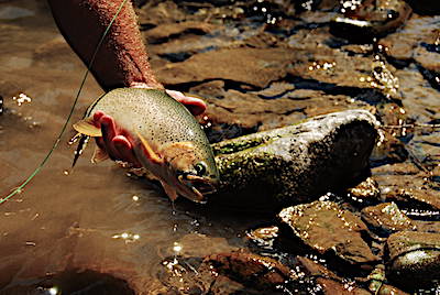 Take, for instance, a recent trip I took to the South Fork with a couple friends. We started at the Meadow Creek Trailhead on the lower South Fork and charged in about 10 miles, burdened by 50-pound backpacks and the previous evening’s toxic dreams, courtesy of the Bucksnort Bar. We set up camp in a grove of aspens just 30 yards from the stream. A few moments after the tents were erected I cast an obnoxiously large, size-10 Royal Wulff over the current. If I remember correctly, the first cast rose a fish, but I was too startled to set the hook. The next cast brought a fish from bedrock to the top. An explosion occurred at the surface and moments later I twisted a fly from the mouth of an eight-inch cutthroat and set that fish free. Fifteen minutes later I’d released four or five more fish including a 16-inch, solidly built, firm-fleshed specimen. I may have been the first person to handle that fish.