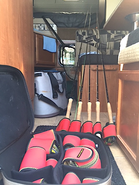 A friends arsenal, always strung in the back of the camper, ready to hit the river and throw. Yes, he’s got issues.
